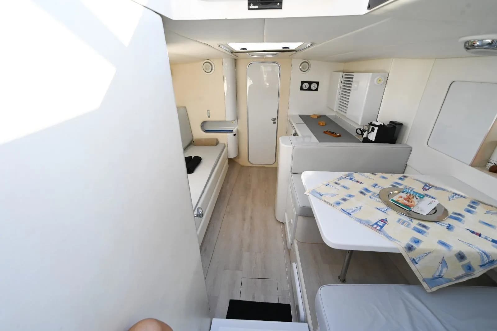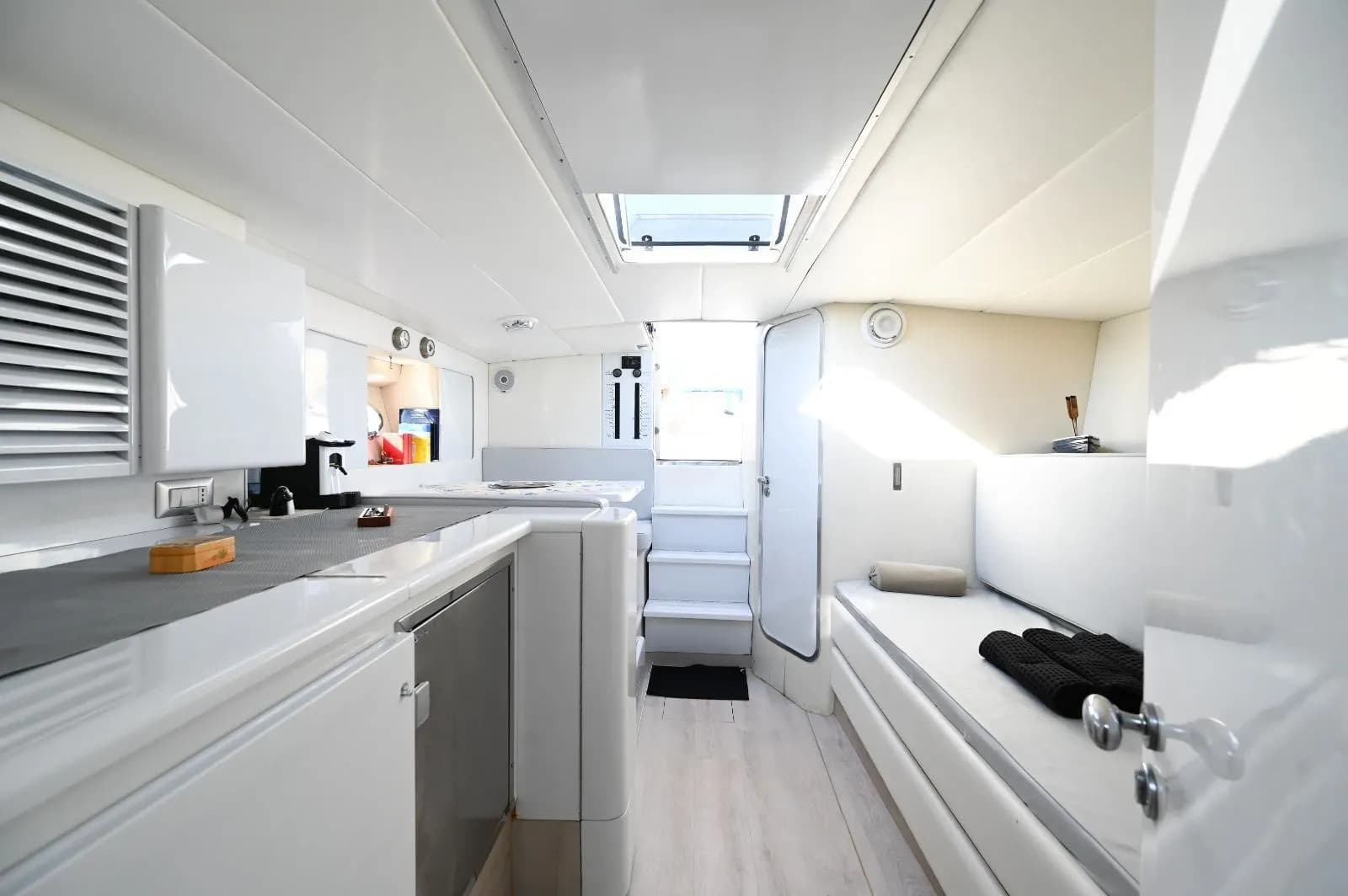 Il design del Bavaria 38 è pensato per chi ama vivere il mare senza filtri. L’ampio prendisole di prua ti invita a distenderti e lasciarti cullare dal ritmo delle onde durante le soste, mentre la zona di poppa, con la sua comoda scaletta, trasforma ogni bagno in un momento di puro piacere. Se il sole si fa troppo caldo, gli interni offrono un rifugio fresco e accogliente: ampi spazi dove cambiarsi d’abito in totale privacy o godersi un momento di riposo dopo una nuotata al largo di Praiano o Amalfi.